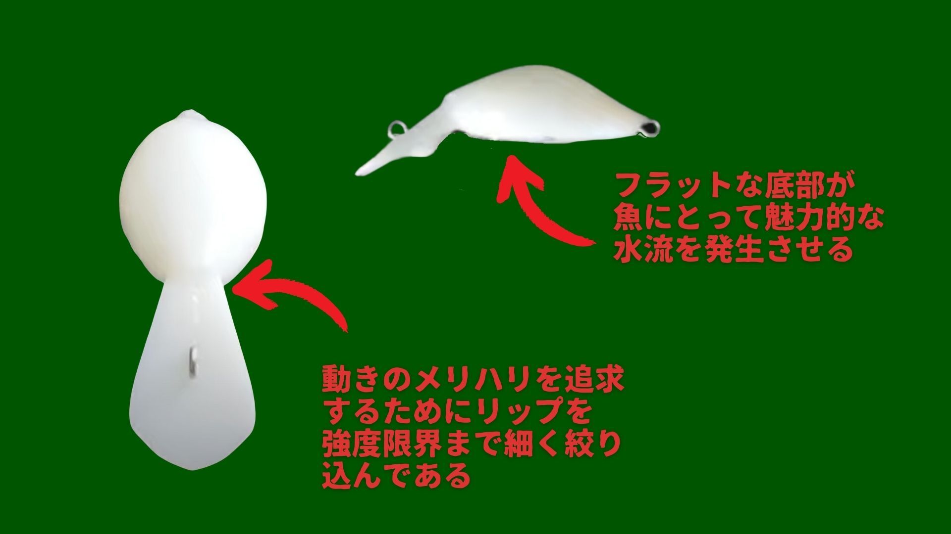 実際、水平なボディは泳ぎが不安定になることが多いが、その課題を膨大なテストによる調整で克服することによりトラウトによって魅力的な水流を発生させている。